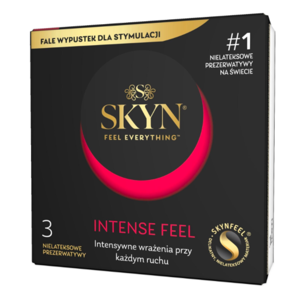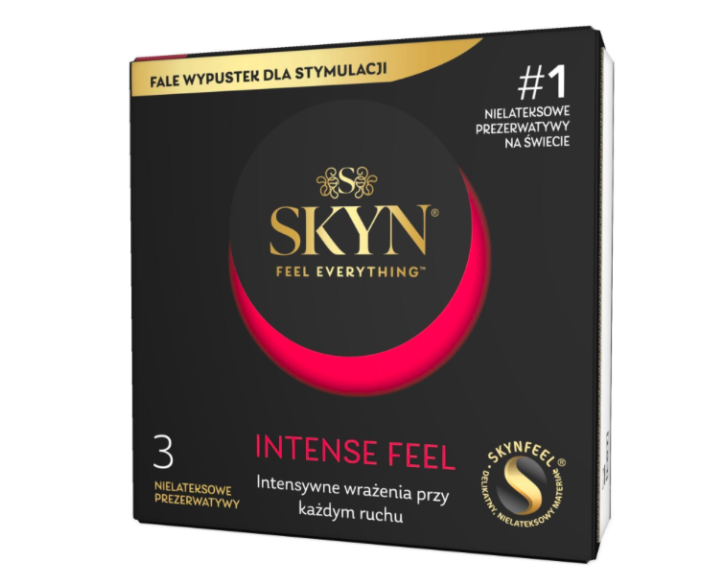 SKYN Intense Feel – безлатексні засоби для захисту з текстурованим рельєфом у формі точок, створені для максимального задоволення та підвищення чутливості під час інтимної близькості. Завдяки інноваційному матеріалу вони забезпечують ідеальне поєднання захисту, комфорту та природних відчуттів. Виготовлені з поліізопрену – інноваційного матеріалу, який не містить латексу та підходить для людей з чутливою шкірою.