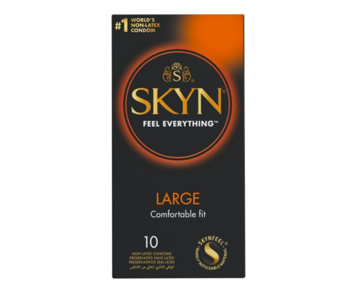 Безлатексні презервативи SKYN Large виготовлені з революційного матеріалу SKYNFEEL® — ідеально м’якого та тонкого, який щільно прилягає до тіла, та не заважають відчути все повною мірою.