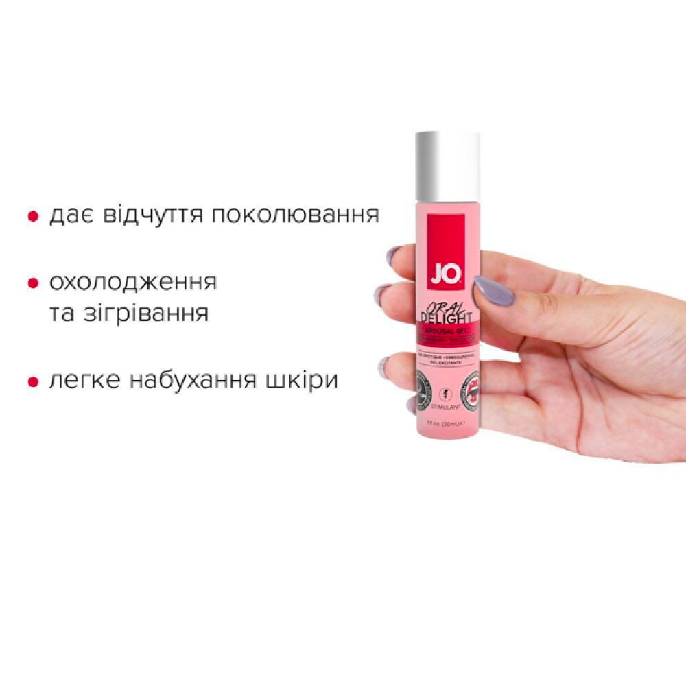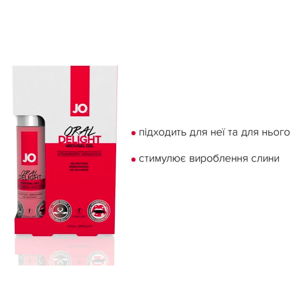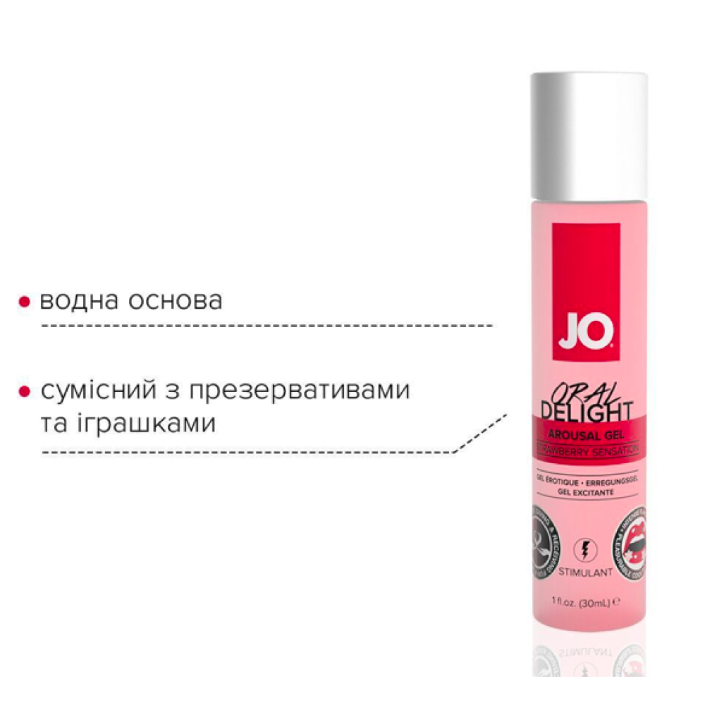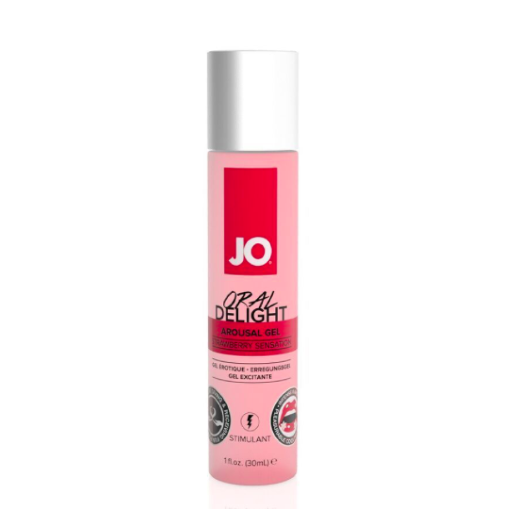 Збудливий гель для оральних пестощів JO ORAL DELIGHT — STRAWBERRY SENSATION (полуниця) — це ароматизований стимулювальний засіб на водній основі, що допомагає як зробити задоволення партнеру, так і отримати його самому. Подвійний ефект — відчуття тепла та холоду одночасно — досягається завдяки ударному поєднанню екстрактів перцевої м’яти та ментолу. А екстракт бутеа суперба стимулює додаткове набухання клітора та пеніса.