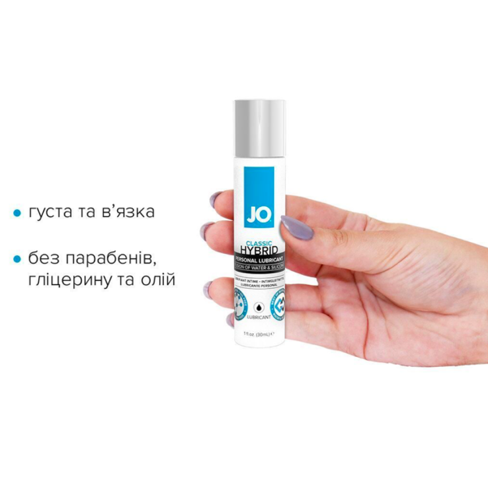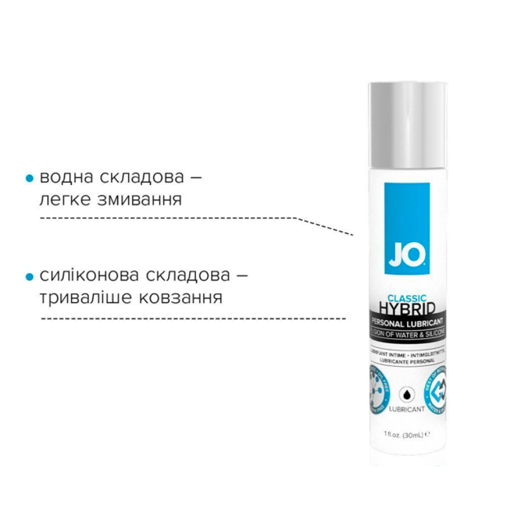 Змазка на комбінованій основі JO CLASSIC HYBRID — це інтимний лубрикант на комбінованій основі, що використовується як доповнення до природної змазки для отримання більшого задоволення від інтимної близькості. Цей засіб без парабенів та гліцерину є свого роду «робочим коником» колекції JO®. Гібридна формула на основі води та силікону забезпечує традиційну тривалість дії та легкість змивання. Ідеальний для тих, хто віддає перевагу засобам із густою гелеподібною консистенцією, які, танучи, перетворюються на легку гладеньку змазку!