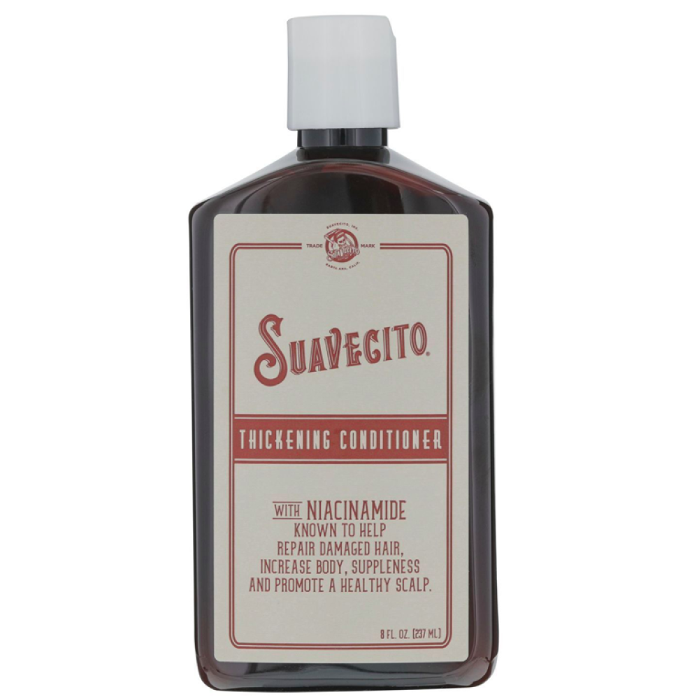 Кондиціонер Suavecito Thickening Conditioner виготовлений з таких інгредієнтів, як біотин, олія розмарину та кофеїн, які, як відомо, сприяють росту волосся. Головний інгредієнт, ніацинамід, є формою вітаміну B3, який, як відомо, відновлює пошкоджене волосся, покращує його структуру та регулює його стан.