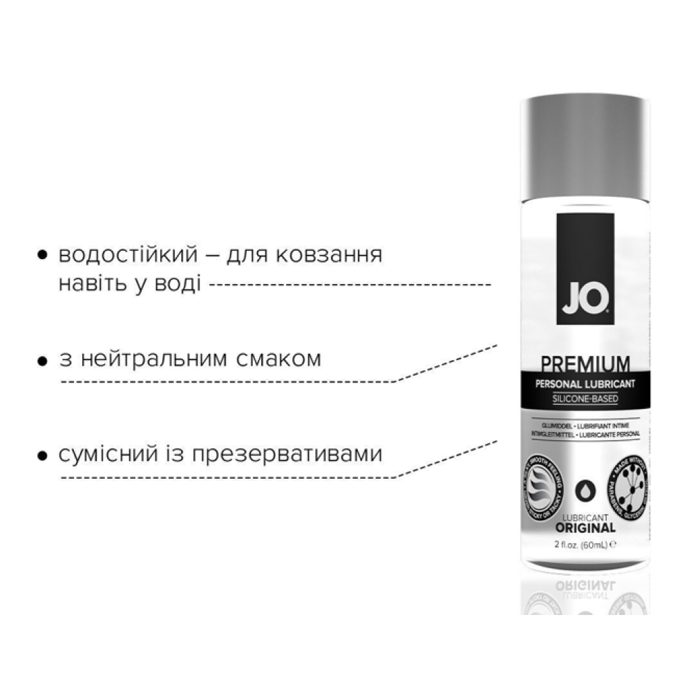 JO® PREMIUM — це інтимний лубрикант на основі силікону, що використовується як доповнення до природної змазки для отримання більшого задоволення від інтимної близькості. Забезпечує довге ніжне оліїсте ковзання, водостійкий, ідеально підходить для пестощів у нестандартних умовах. JO® PREMIUM не містить консервантів і виготовлений із застосуванням силікону лише найвищої якості. Невеликої кількості вистачає надовго!