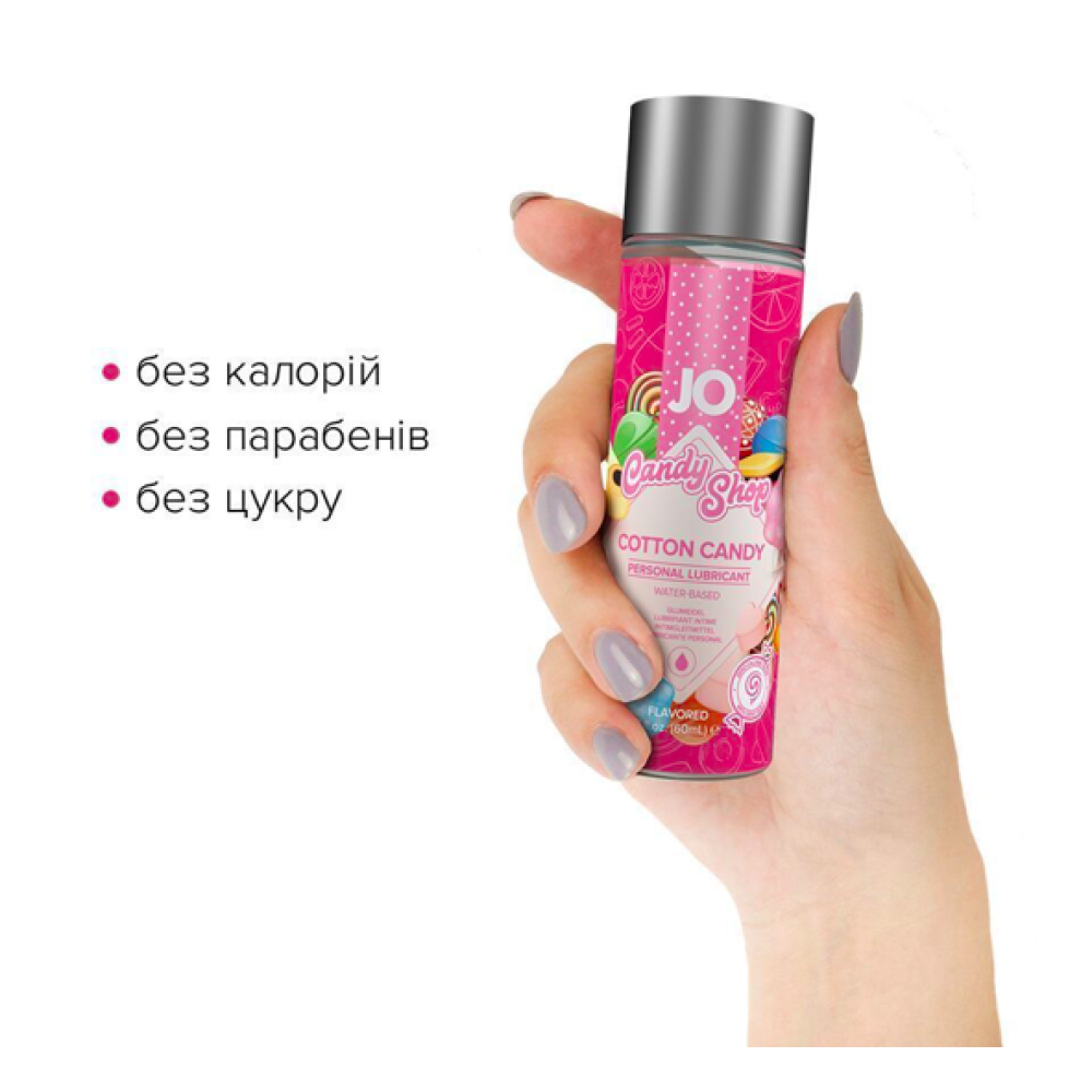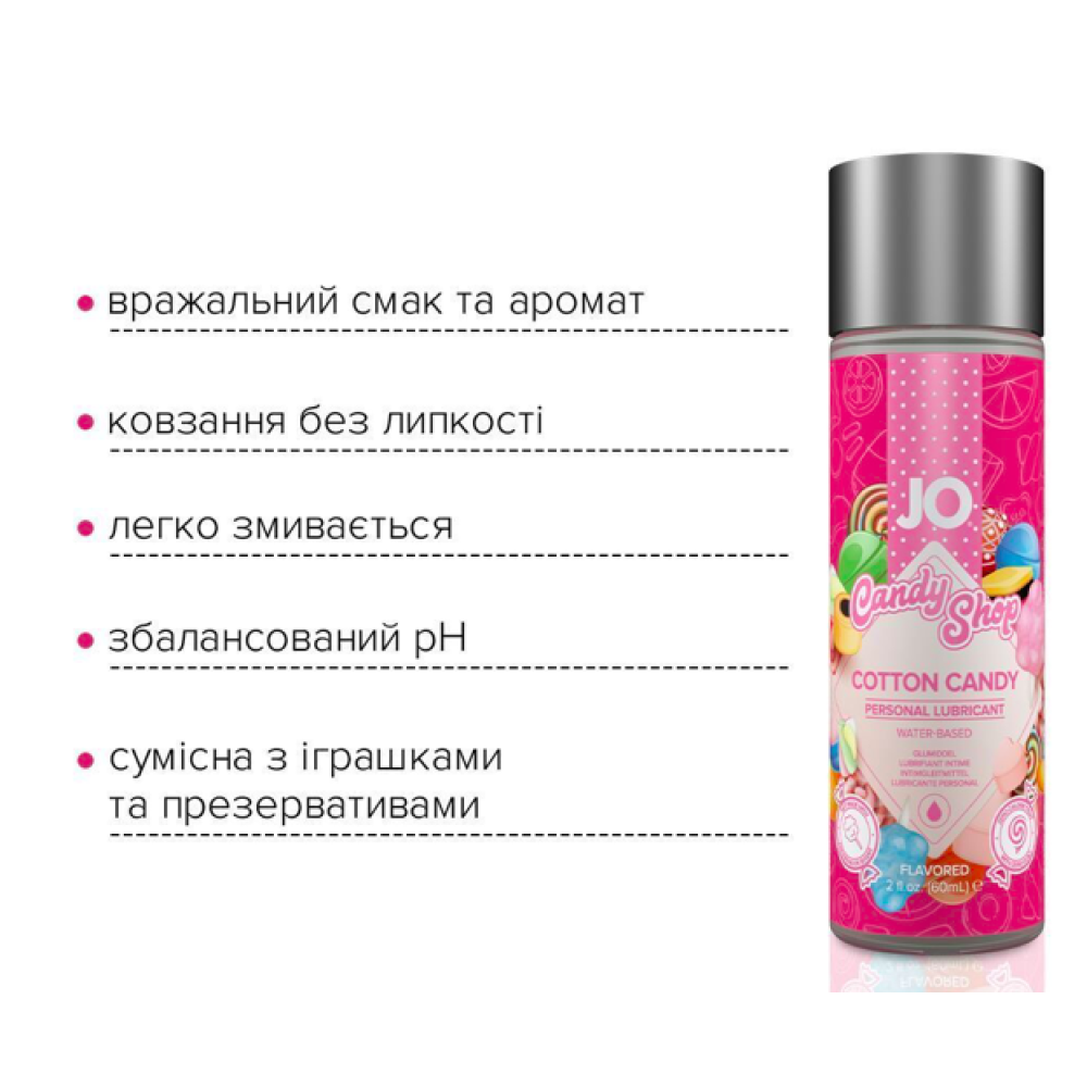Пропонуємо купити лубрикант на водній основі JO H2O — Candy Shop — Cotton Candy з приголомшливим насиченим смаком цукрової вати. Створено з використанням гліцерину виключно рослинного походження. Усі інгредієнти найвищої якості та лише натуральні смакові ароматизатори. У формулі лубриканта немає цукру, штучних підсолоджувачів, парабенів та пропіленгліколю. Продукт забезпечує комфортне ніжне ковзання без липкості. Абсолютно безпечний для орального застосування, немає післясмаку.