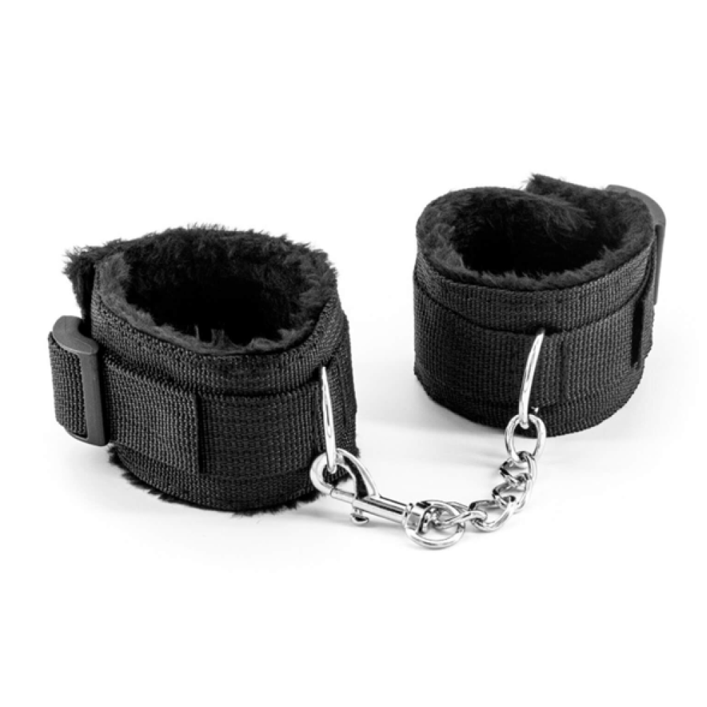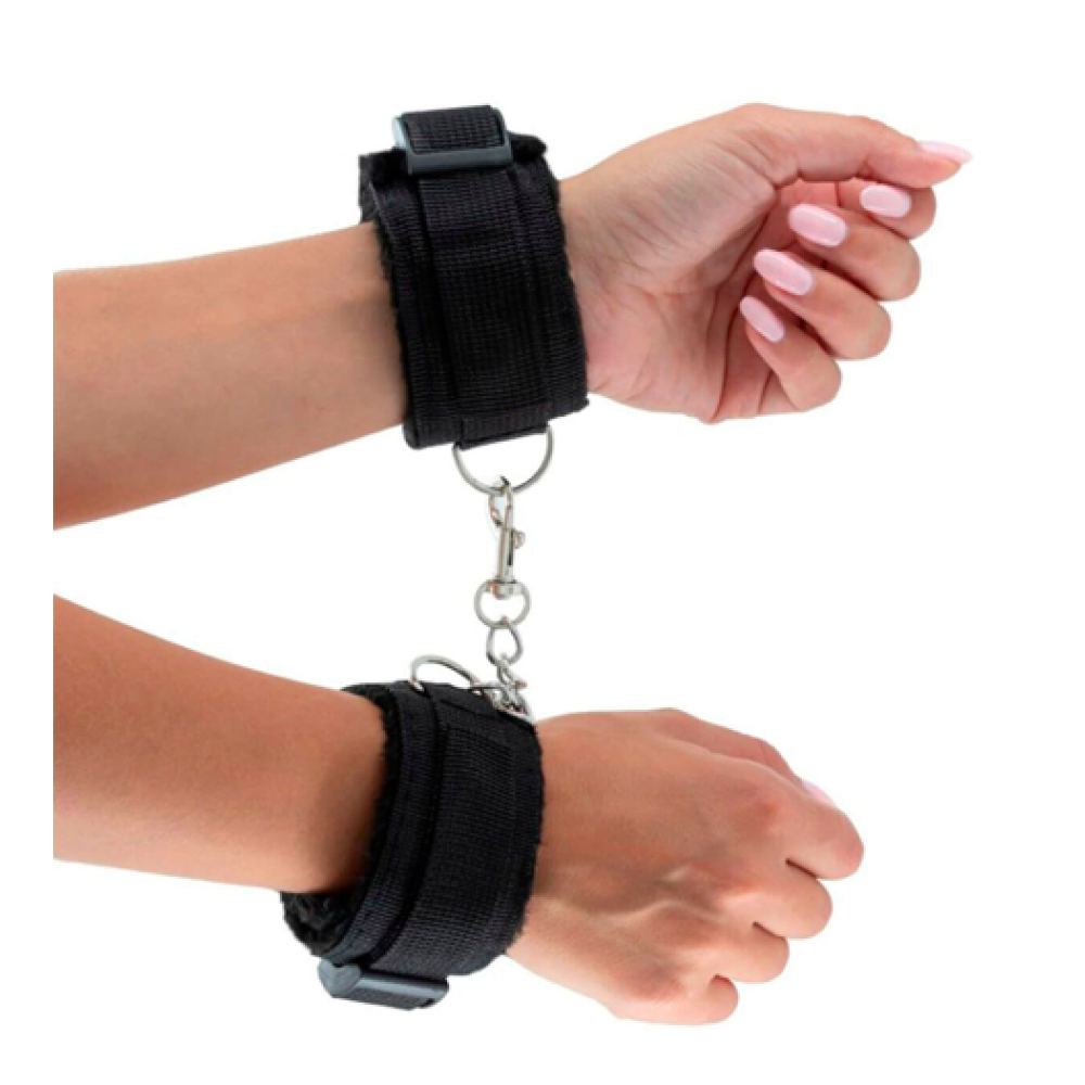 Наручники для сковування рук. Максимальна довжина 32 см, ширина 5 см, регульований ремінець від 15 до 30 см. На наручниках є ланцюжок із карабіном, завдяки чому їх зручно з’єднувати між собою або з браслетами на щиколотках. Також ви можете приєднати манжети на зап’ястях до нашийника.