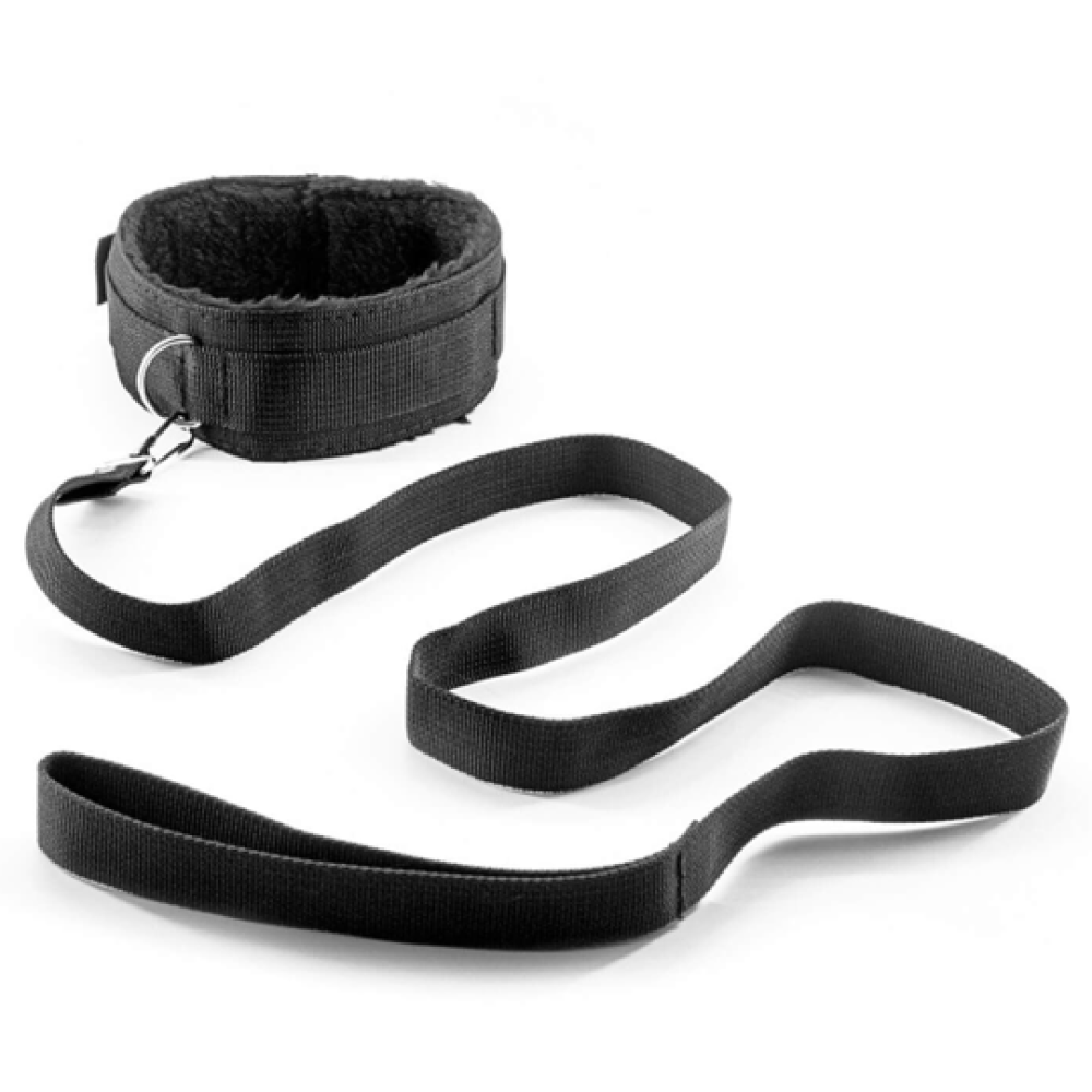 Нашийник із повідцем для пет-плей та різних комбінацій зв’язки з браслетами на руках та ногах. Максимальна довжина 50 см, ширина 5 см, регульований ремінець від 32 до 48 см. Довжина повідця 96 см, ширина 1,5 см, розмір карабіна — 4 см. Грайте в пет-плей, фіксуйте шию партнера або об’єднуйте в одну зв’язку нашийник, наручники та фіксатори для ніг — вас обмежує тільки ваша уява.