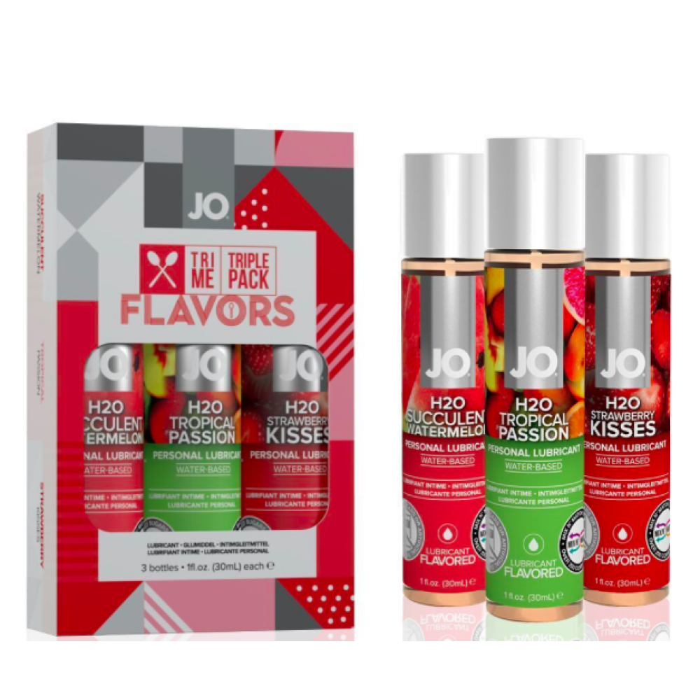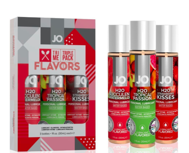 Набір складається з трьох популярних змазок на водній основі з популярними смаками: тропічна пристрасть (JO H2O Tropical Passion), соковитий кавун (JO H2O Watermelon) та полуничний поцілунок (JO H2O Strawberry Kisses).