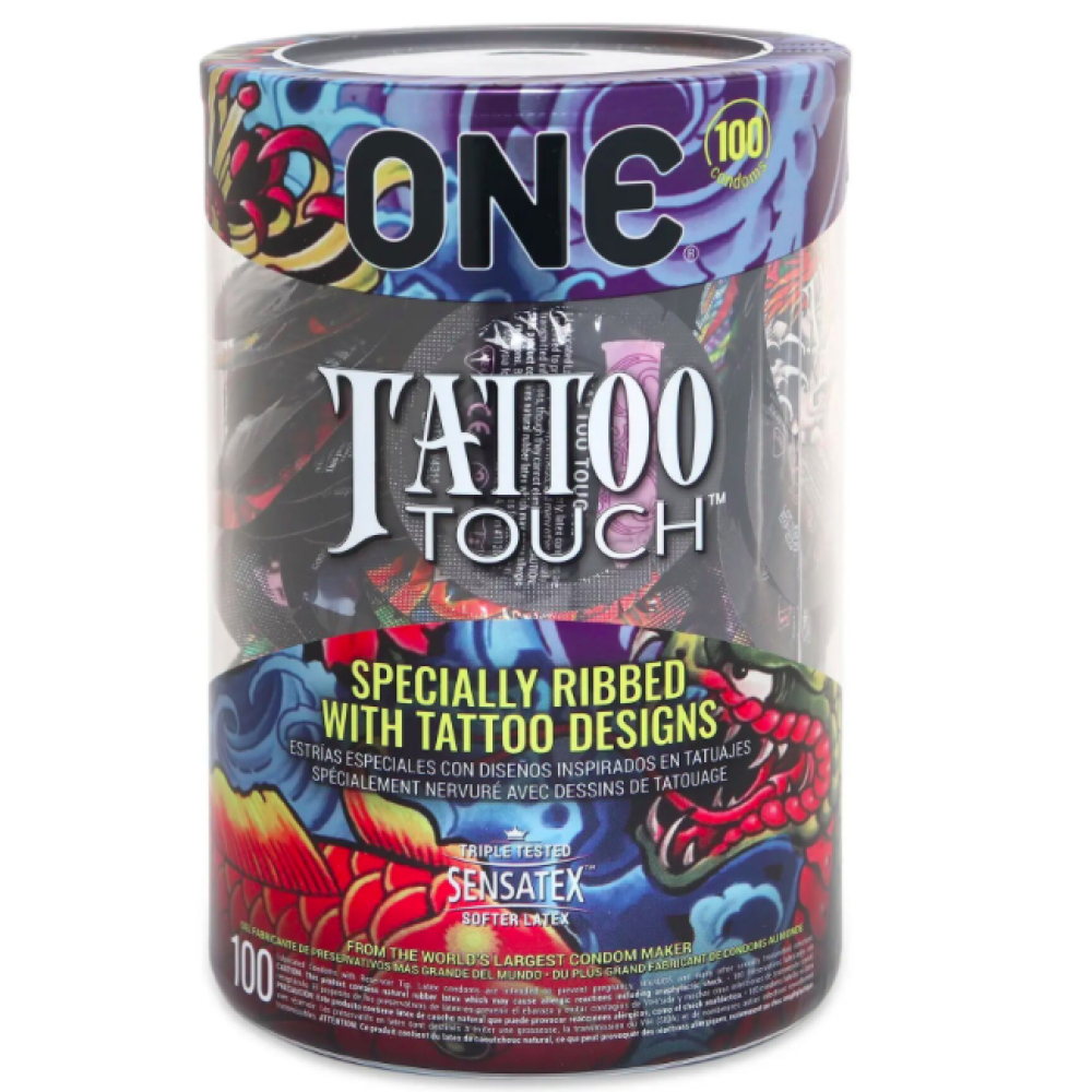 ONE Tattoo Touch із ребристою текстурою у вигляді татуювань. У яскравому подарунковому тубусі ви знайдете 100 презервативів у трьох варіантах забарвлення та дизайну — експериментуйте з тактильними відчуттями скільки душі завгодно! Малюнки з об’ємних тонких ліній додатково масажують ерогенні зони під час чуттєвих фрикцій.