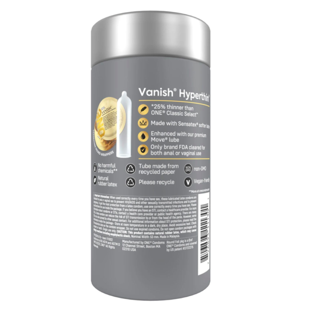 Презервативи виготовлені з високоякісного латексу Sensatex — дуже м’якого та еластичного. Цей матеріал оцінять ті, хто обожнює максимальне зближення та дотик «тіло до тіла». Посмійтеся з тих, хто жартує, що кохатися в презервативі — усе одно що цілувати руку в рукавичці. Ультратонкі презервативи ONE Vanish Hyperthin із гладенькою поверхнею подарують вам небувалу чуттєвість! Водночас вони настільки міцні, що підійдуть не тільки для вагінального, але і для анального проникнення.