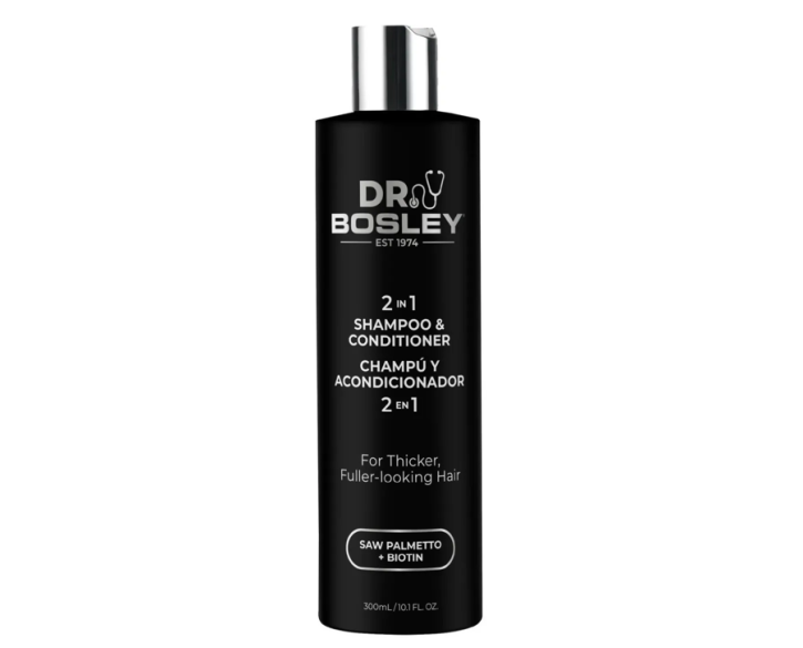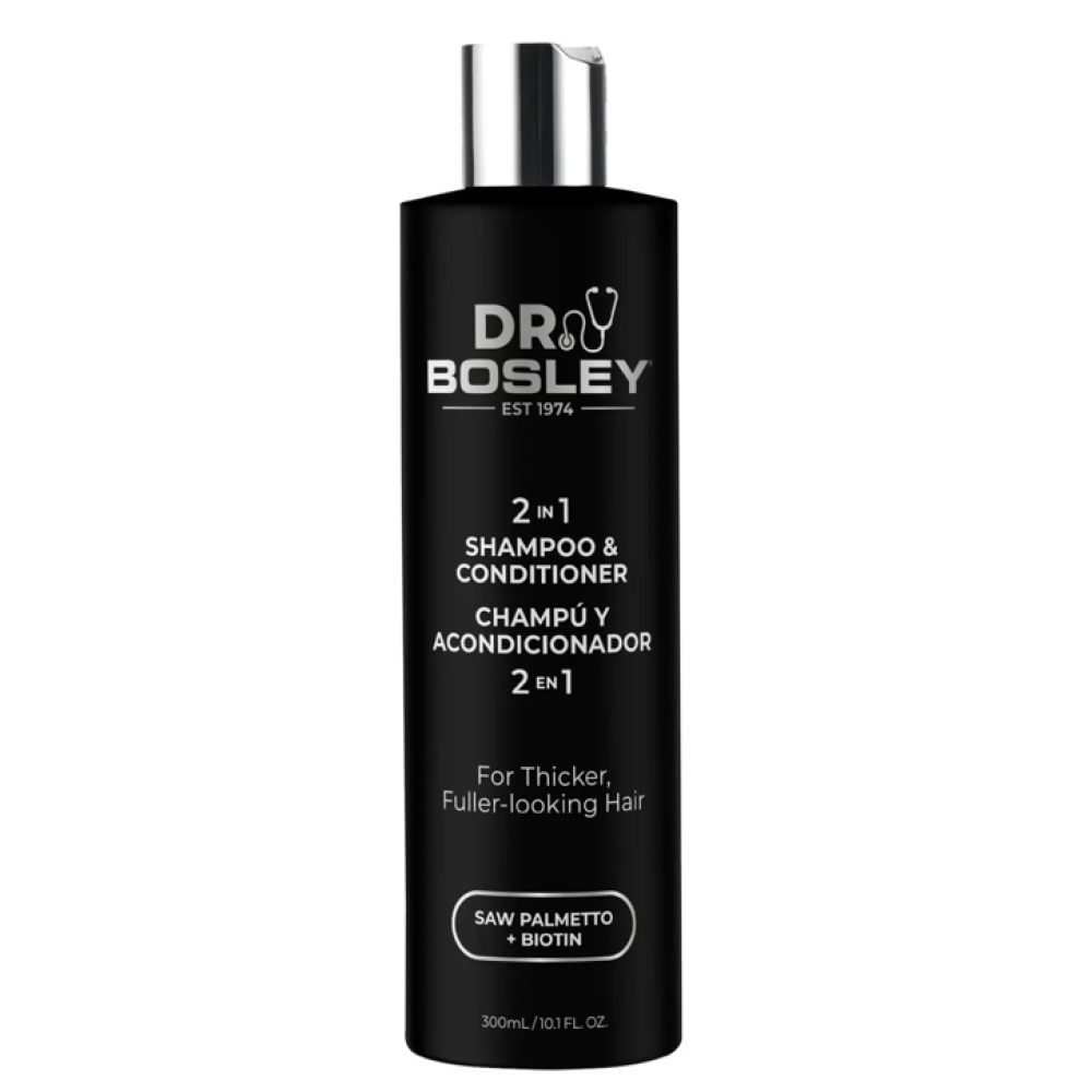 BosleyMD Dr. 2-in-1 Thickening Shampoo & Conditioner — це інноваційний продукт для догляду за тонким, схильним до випадання та ослабленим волоссям. Засіб поєднує функції м'якого очищення та кондиціювання, зміцнює стрижень волосся, надає візуальної густоти та бореться з впливом DHT – одного з головних факторів стоншення.