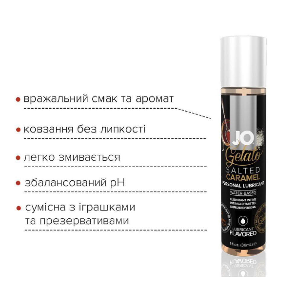 Лубрикант на водній основі JO GELATO SALTED CARAMEL, солона карамель (30 мл) з колекції інтимних смакових лубрикантів, створених спеціально для яскравої прелюдії та комфортної близькості. Виготовлені з використанням гліцерину на рослинній основі та інших високоякісних інгредієнтів, засоби цієї колекції забезпечують приємне та тривале ковзання. У формулі цих смакових лубрикантів немає цукру, парабенів та пропіленгліколю — для м’якшого ковзання. Без липкості та післясмаку.