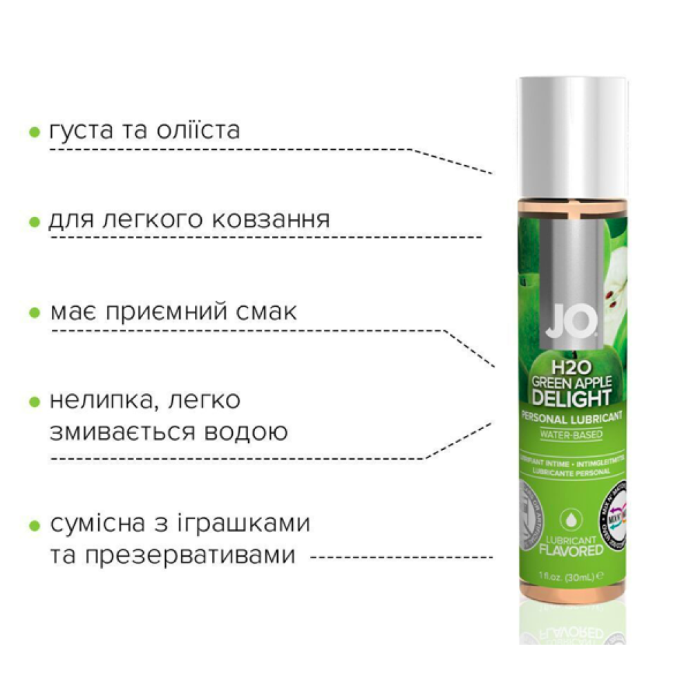 Лубрикант на водній основі JO H2O — GREEN APPLE яблучне захоплення — це інтимний лубрикант із широкою гамою насичених ароматів із колекції ароматизованих засобів JO® H2O.