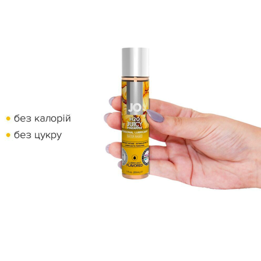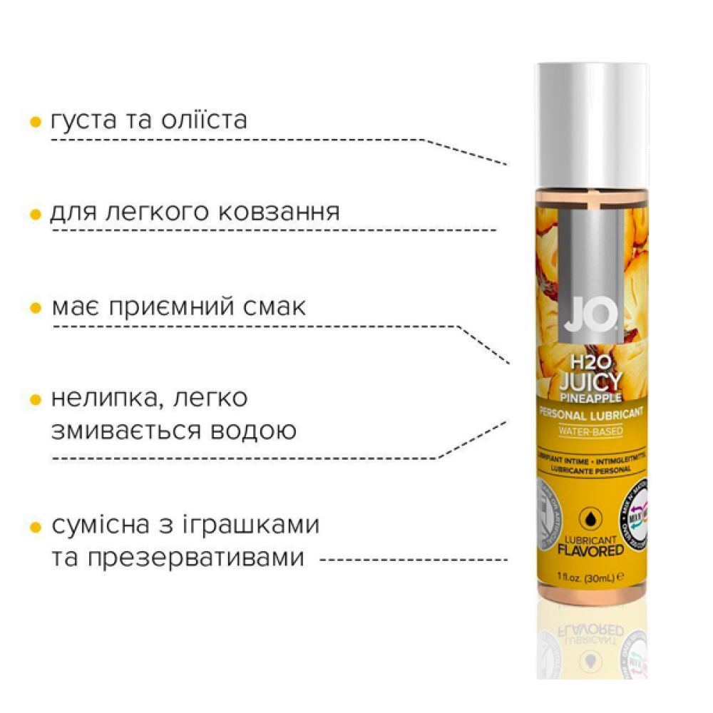 Лубрикант на водній основі JO H2O — JUICY PINEAPPLE соковитий ананас — це інтимний лубрикант із широкою гамою насичених ароматів із колекції ароматизованих засобів JO® H2O.